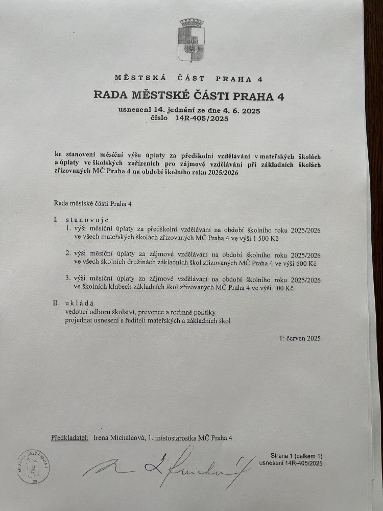 Stanovení výše úplaty za školné v MŠ (pro školní rok 2025/26)